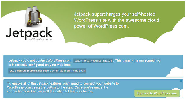 Jetpack could not contact WordPress.com: token_http_request_failed. This usually means something is incorrectly configured on you web host. SSL certificate problem: self signed certificate in certificate chain